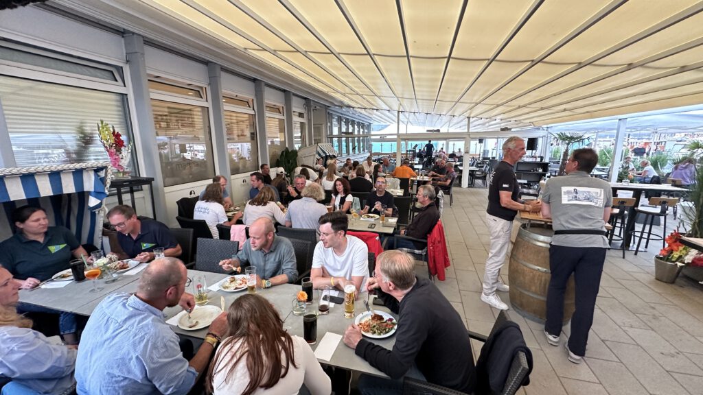 Insgesamt verläuft der zweite Wettfahrttag für die Teams vom HSC sehr positiv, seglerische Konstanz und die zwei Wettfahrtsiege lassen uns in der Gesamttabelle auf die Plätze 4 und 5 vorrücken. Dabei trumpft besonders das Team JOLA stark auf, als sie in der dritten Tageswettfahrt auch noch den 2.Platz belegen. So kann es weitergehen – wünschen wir uns bei der Anleger-Pasta.