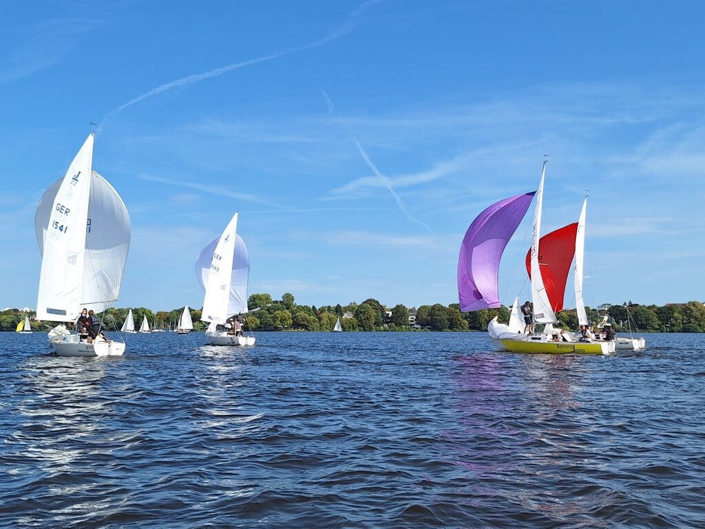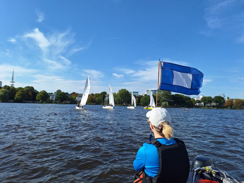 Fünf J22 auf der Alster, gut zwanzig Starts und ein paar Wettfahrten: drei Minuten Startlinie suchen, Wind verstehen, positionieren, verteidigen, angreifen und dann Geschwindigkeit on point – gut geklappt? Gleich nochmal! Diesmal 10 Sekunden zu spät an der Linie – war der gute Start vorhin doch Zufall? „Ihr müsst so lange starten üben, bis ihr verlässlich bei Null an der Linie seid – Euch fehlt die Konsistenz.“ sagt Coach Silke Basedow zu sowas – und viel mehr.
