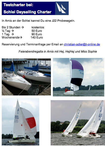 Übrigens: Der Vercharterer an der Schlei bietet J/22-Interessierten ein kostenloses Probesegeln an. 2 Stunden sind kostenlos, 30% Rabatt erhält man bei einer Miete von 1/2 oder 1 Tag. (Stichwort: “Probesegeln J22kv”)
