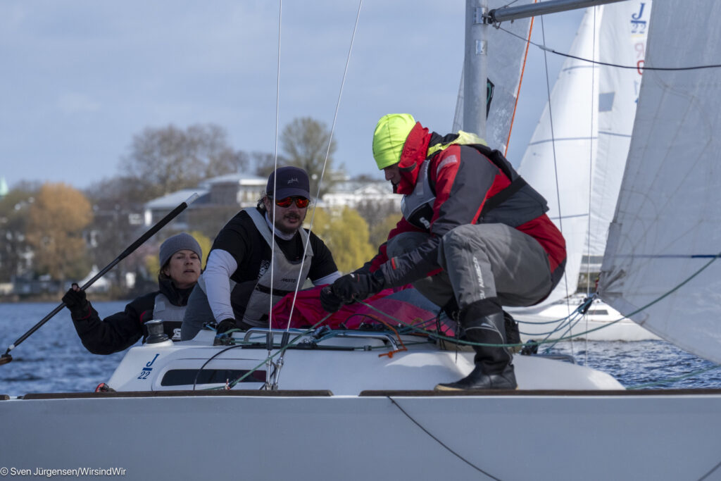 Mit 7 J/22 stellten wir zwar das kleinste Feld, waren aber für die J/24 und J/70 Vorreiter, um vor dem eigenen Start einen Vorgeschmack auf die Alster an diesen beiden Tagen zu bekommen. Nicht nur für die Segler, sondern auch für die Wettfahrtleitung eine Herausforderung, für alle drei Klassen sieben faire Races durchzuführen, was bei der Erfahrung vor Ort perfekt gelang.